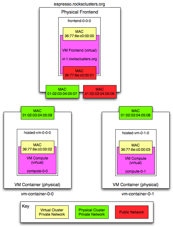 In the above picture, "espresso.rocksclusters.org" is a physical machine. Also, "vm-container-0-0" and "vm-container-0-1" are physical machines that were kickstarted by "espresso". The machine "frontend-0-0-0" is a virtual machine that is hosted by "espresso". The machines "hosted-vm-0-0-0" and "hosted-vm-0-1-0" are VMs that are associated with "frontend-0-0-0" (they are all in the same VLAN).